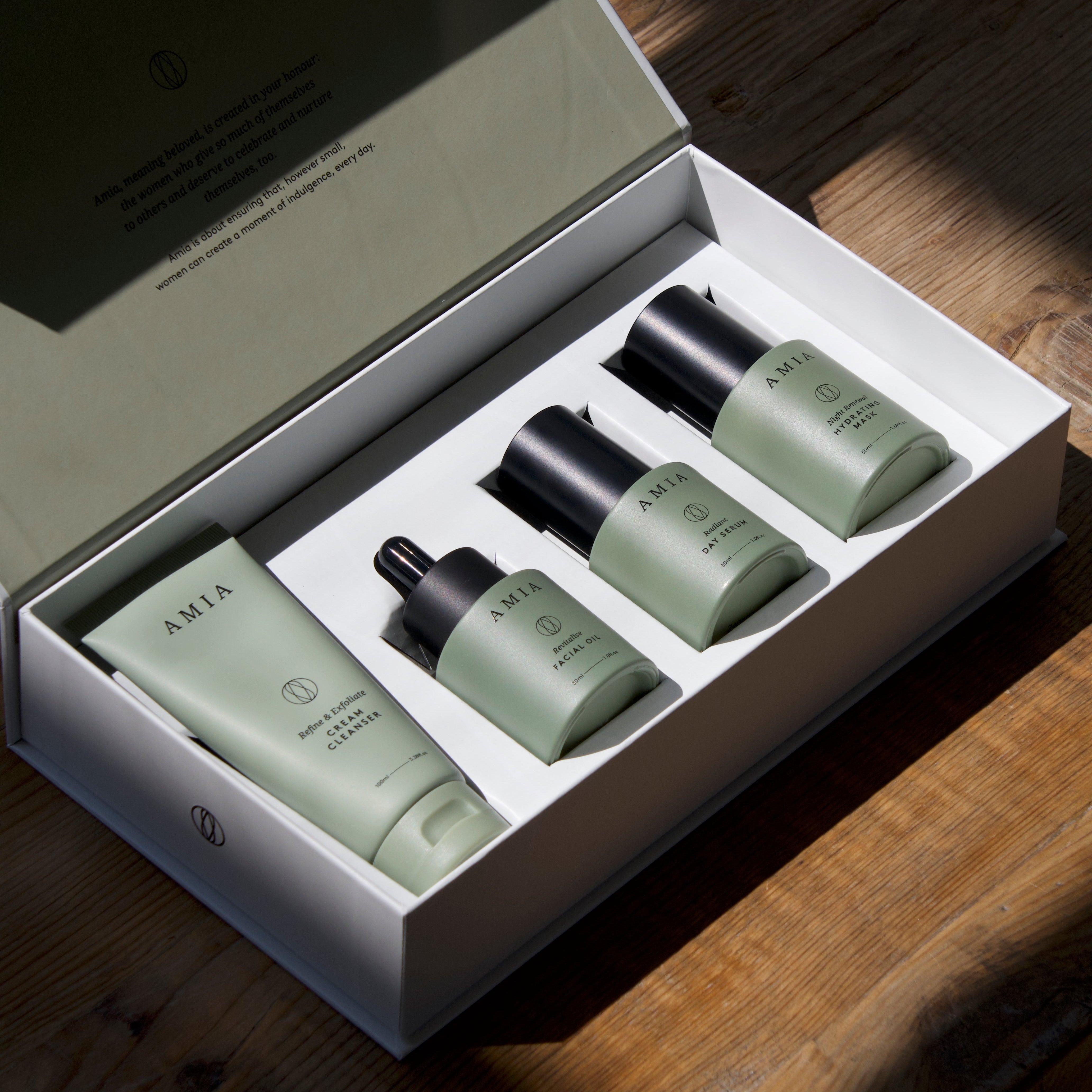 - KSK S.Verified ReviewerRated 5 out of 5 starsStandout SkincareAMIA is a must! This is an absolutely amazing line of products. Over the years, I have tried everything on the market and nothing left me going wow until AMIA. This gift set got me hooked and AMIA is now a regular part of my skin care routine. Potentially the best kept beauty skincare secret, so I’m making sure I shout it from the rooftops that you need to try this. If you want your skin to look and feel fresh and better than you have ever experienced, then this is it! Was this helpful?